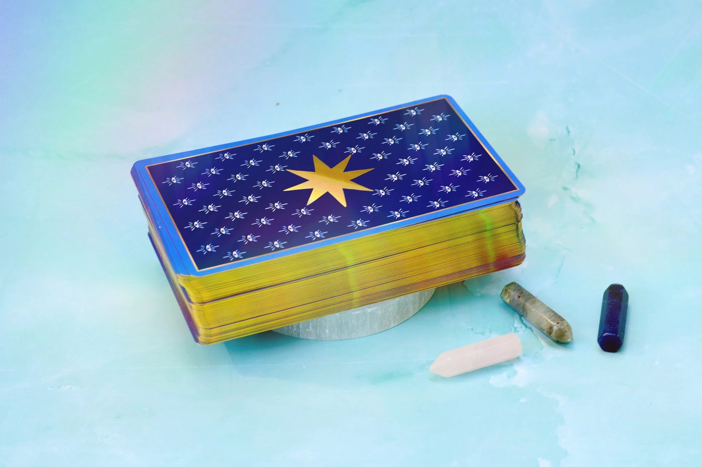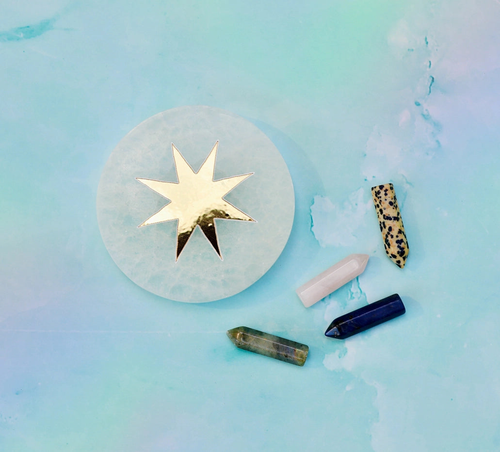 Cleanse and recharge your Tarot deck, crystals, jewelry, or cherished keepsakes with our 3" Selenite Clearing Disc, elegantly embossed with the Explorer of the Soul star in radiant gold foil.